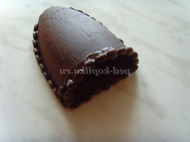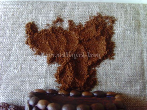 А можна і зробити по - іншому. Спочатку заготівлю намазати клеєм ПВА, а потім посипати меленою кавою (мені другий варіант не дуже сподобався, цей варіант підійде для тих, хто кавові зерна приклеює тільки на гарячий клей; я ж користуюся в основному «Титаном», а гарячий клей використовую в тих випадках, коли потрібно, щоб кава відразу кинулося; і я зафарбувала зверху заготівлю знову гуашшю)
