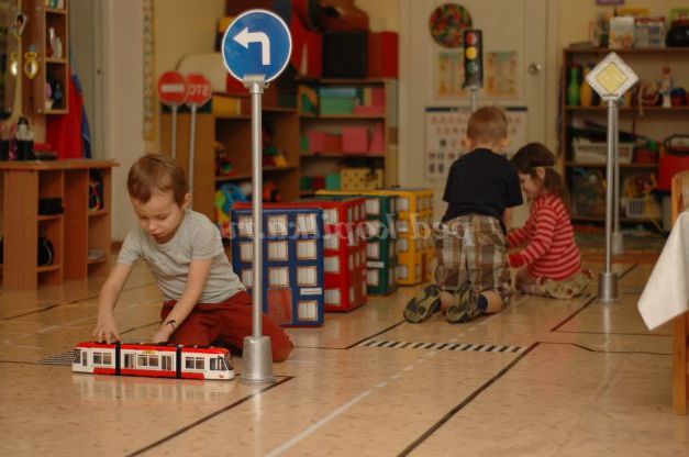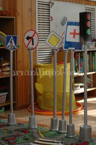 Ідея наступній серії фотографій теж почерпнута в інтернеті. Ідея нанесеного малюнка на підлозі групи. Приміщення у нас не велике. І розташувати куточок ПДР десь окремо не представляється можливим. У минулому році ми вже змайстрували дорожні знаки. Вірніше спеціальні стійки з можливістю зміни знаків на них.