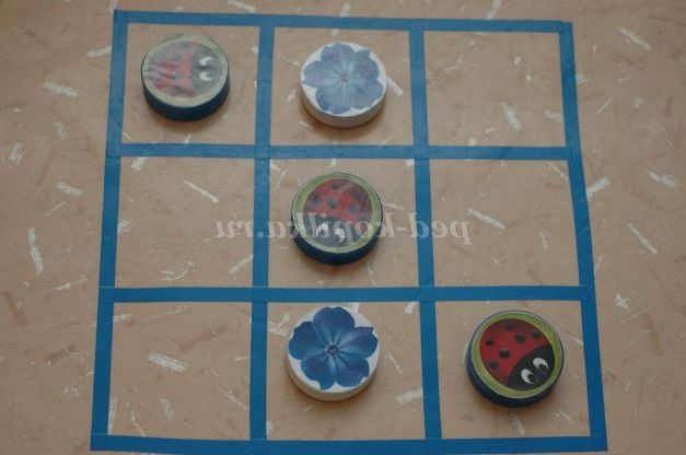 У нас вийшло два ігрових поля, тому комплектів фішок теж два. Зроблені вони з пластикових кришок на трилітрові банки. Кожна фішка складається з двох кришок. Всередину ми поклали пластиліну для вагомості фішки, можна нутрощі заповнити папером, щоб кришки не проминались. Місце стикування і всі ребро обмотали все тієї ж ізолентою. На верх і низ фішки зробили картинки квіточок, бджілок, божих корівок. Ребетня грає із задоволенням, головне, навчити їх, як це робити!