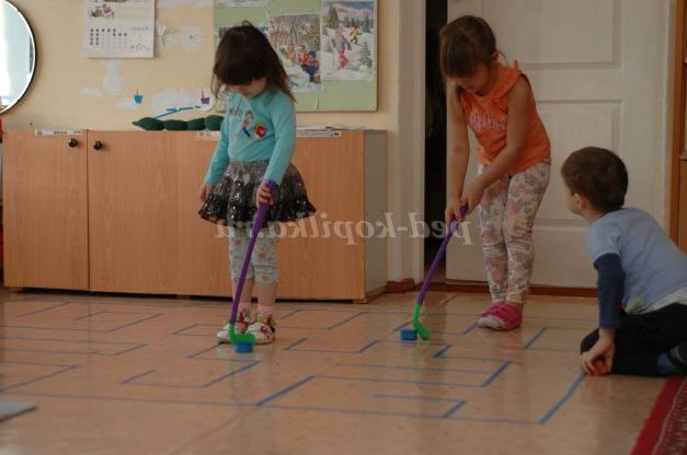 По цьому лабіринту не тільки наші дітки із задоволенням ходять, але і кожен дорослий, який потрапив у групу, вважає своїм обов'язком подолати цю перешкоду! При цьому, ми вирішили ускладнити завдання... Ми ж не хочемо, щоб лабіринт вивчили і забули... З кришок від п'ятилітрових пляшок ми зробили шайби. І тепер ребетня старанно намагається шайбу ключкою довести від входу до виходу. Не повірите, це дуже важко! Треба стежити, щоб шайба не "втекли" за кордон лінії, інакше доведеться повернутися в початок шляху!!! А поки стежиш за шайбою, можеш і потрібний поворот пропустити, доводиться бути гранично уважним і зосередженим! Як тільки освоют цей варіант гри, замість шайб запропонуємо маленькі м'ячики... і так з ускладненням.