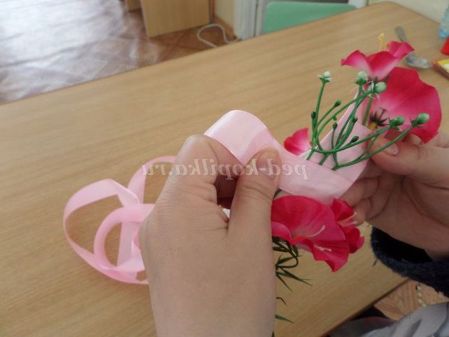 Крок п'ятий:тепер починаємо намотувати стрічку навколо основи, щільно притискаючи квіти.