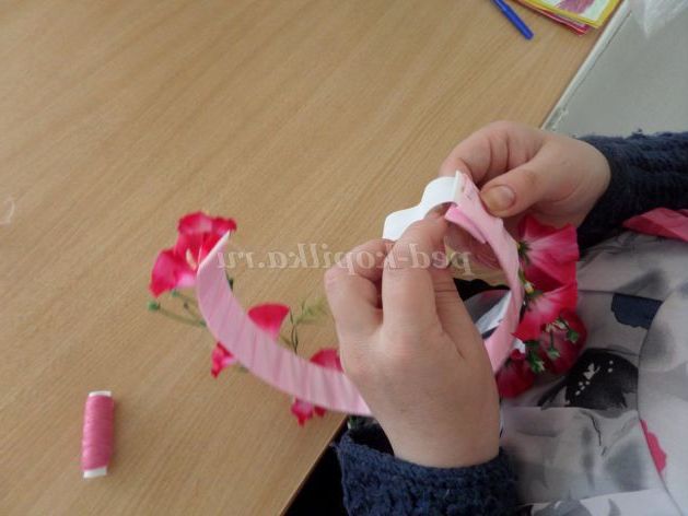 Завдання: познайомити зі способом плетіння вінка з штучних квітів, розвивати дрібну моторику рук, увагу, естетичний смак. Виховувати дбайливе ставлення до праці інших людей.