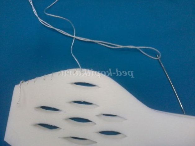 16. Складаємо 2 деталі і зшиваємо по краю швом через край. Нитка сильно не затягуємо, тому ізолон може порватися. На початку і В кінці шва нитку зав'язуємо і закріплюємо за допомогою гарячого пістолету.