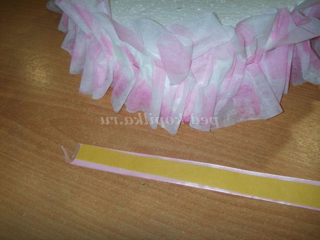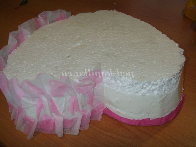 Приклеюємо флористичний фетр яскраво-рожевого кольору, обрізаємо зайвий фетр на відстані 1-2 см від краю пінопласту, підгинаємо і приклеюємо краю на двосторонній скотч