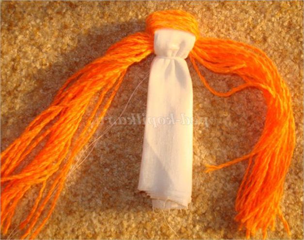 3. Оформляємо голову ляльки. Для цього з пряжі нарізаємо нитки довжиною 15-20 см, якщо хочете зробити довге волосся для ляльки або 10 см, якщо зачіска з короткого волосся.