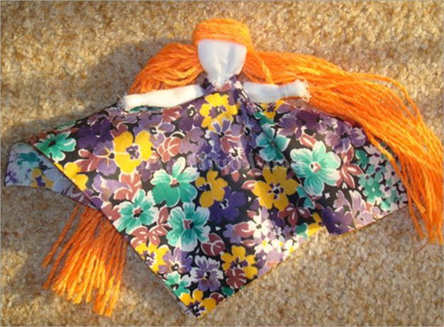 5. Прикрашаємо нашу ляльку-дівчинку. Для цього беремо кольоровий клаптик, згортаємо його по діагоналі і посередині робимо невеликий надріз для голови, і 2 маленьких для рук. Платтячко зручніше одягати через низ.