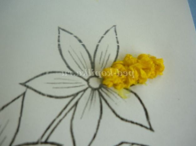 Пластиліном зеленого кольору (світлого відтінку) «зафарбовуємо» листя і стебла квітів - прийом розмазування пластиліну подушечкою пальця.