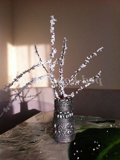 На гілочки обмазані клеєм насипаємо кульки з пінопласту. Стало схоже на гілки, обсипані сніжком.
