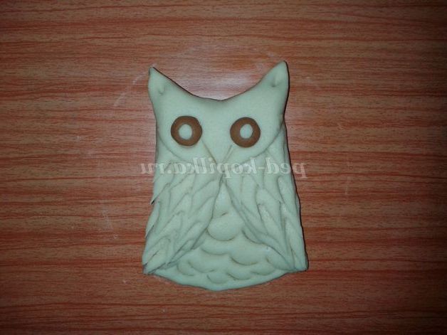 Робимо дзьоб з кісточки від фініка, очі з коричневого і білого тіста. Стеком робимо надсічки (над дзьобом і навколо зіниці).