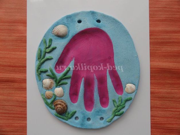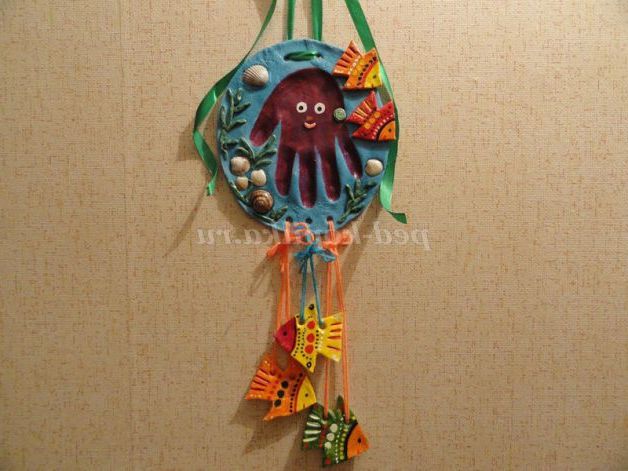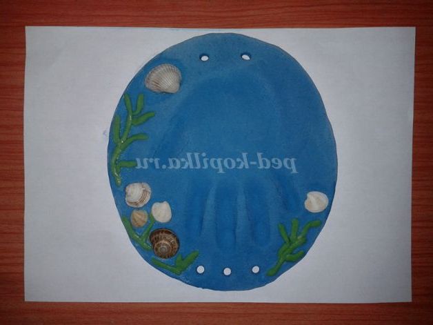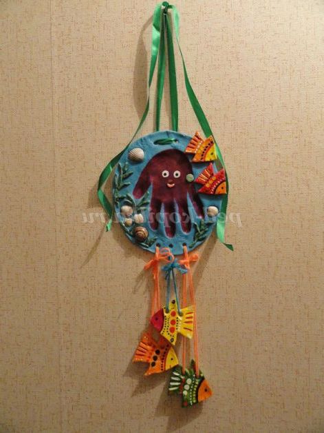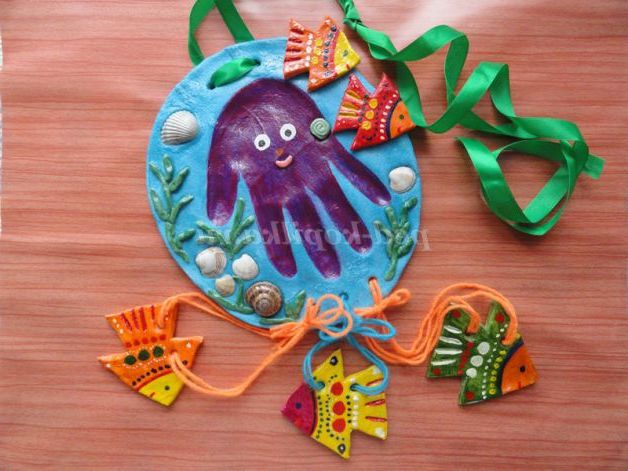 Прикрашаємо нашу підвіску черепашками (вдавлюємо їх в тісто) і робимо водорості з тіста зеленого кольору. Для склеювання використовуйте воду.