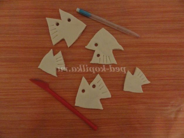 На великих рибок робимо дірочки і стеком прорізаємо на хвостиках плавці.