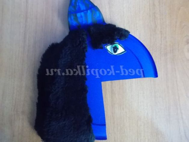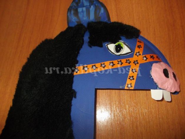 Призначення: Ця саморобка виконана своїми руками з непридатного матеріалу - одноразової пластикової тарілки, може використовуватися як чудовий подарунок до нового 2014 році - році Коні, на удачу рідним і близьким. Також як прикраси інтер'єру до новорічного свята і виставок дитячої творчості на Новорічну тематику.