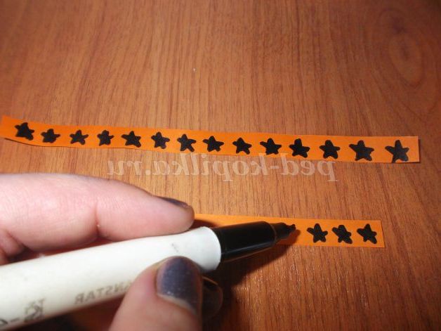 Залишилося зробити нашої конячці красиву вуздечку , її ми робимо з двох смужок кольорового паперу, на яких маркером малюємо зірочки .