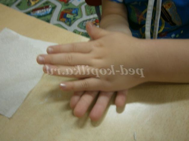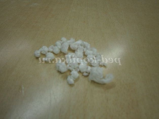 4. Зараз будемо робити бороду і хутряні частини костюма. Нам знадобляться білі серветки, які ми розірвемо на маленькі шматочки і поклавши шматочок між двох долоньок, обертальними рухами будемо скачувати в кульку.