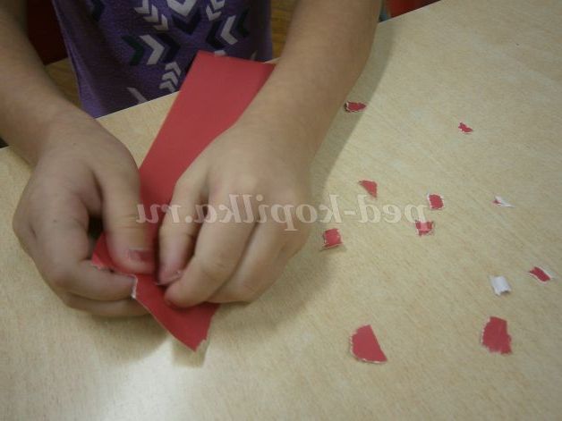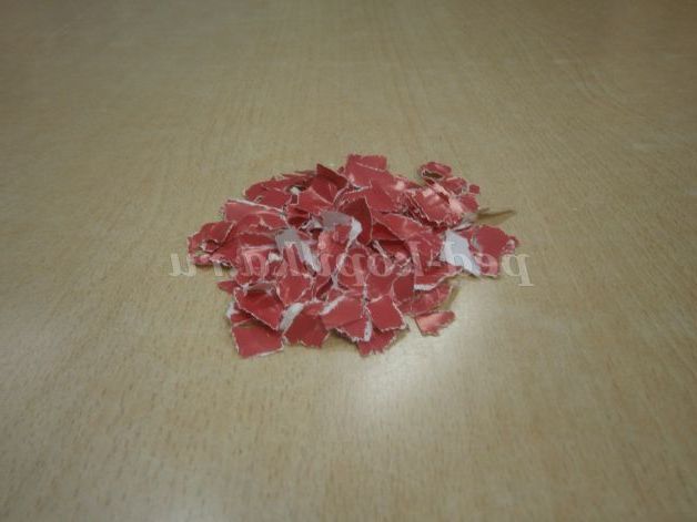 2. Саме перше, що ми зробимо - це шубу Діда Мороза. Для роботи нам знадобитися червона кольорова папір. Її треба розірвати на маленькі шматочки.