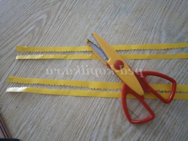 За допомогою фігурних ножиць розрізаємо кожну смужку навпіл.
