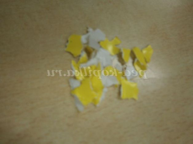 5. Переходимо до виконання місяця і зірок. Для цього рвемо на маленькі шматочки жовту кольоровий папір.