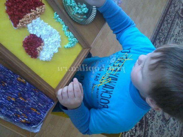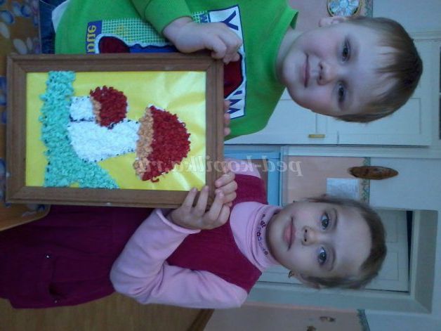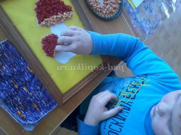 Гриби готові. Зображуємо зелений лужок. Намазуємо під грибами і навколо ніжок клеєм і посипаємо зеленими кульками.
