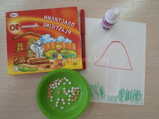 Продовжувати вчити дітей відщипувати шматочок пластиліну, скачувати кулю між долонями круговими рухами, використовувати аплікації додатковий матеріал - горох.