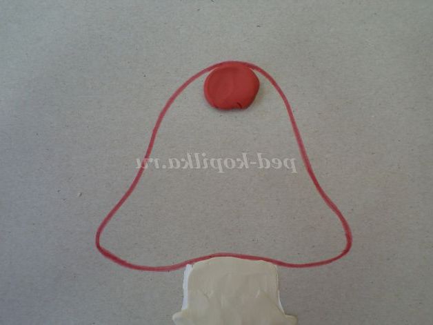 А тепер зробимо капелюшок. Відщипуємо шматочок червоного пластиліну, скачуємо кульку між долонями круговими рухами, вдавлюємо на основу у верхній частині капелюшки.