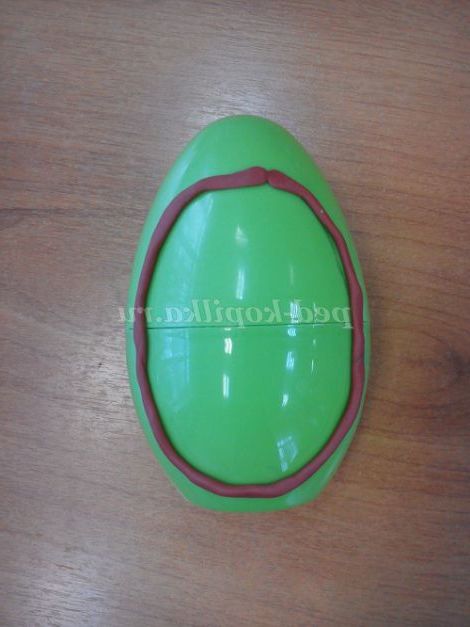 Пластиліном обмазуємо пластмасове яйце починаючи від контуру (фото 12,13)