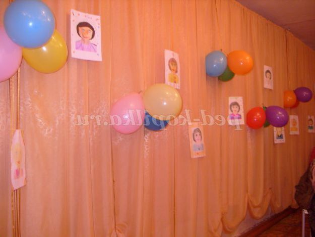 Оформлення залу: повітряні кульки, плакати з вітаннями, стінгазета «Наші дівчата», букети квітів.