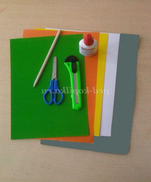Необхідний матеріал: картон: білий, жовтий, зелений, помаранчева кольоровий папір, клей, ножиці, ніж канцелярський, простий олівець, щільна основа для вирізання, шаблони.