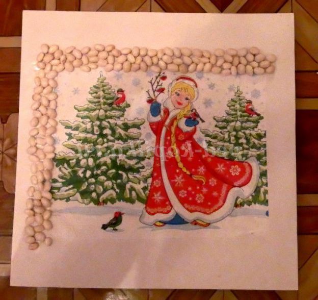 2. По периметру отриманої картинки ми наносимо клей ПВА. Ширина смужки з клею 2 див. На смужку з клею ми викладаємо акуратно білу квасолю по всьому периметру.
