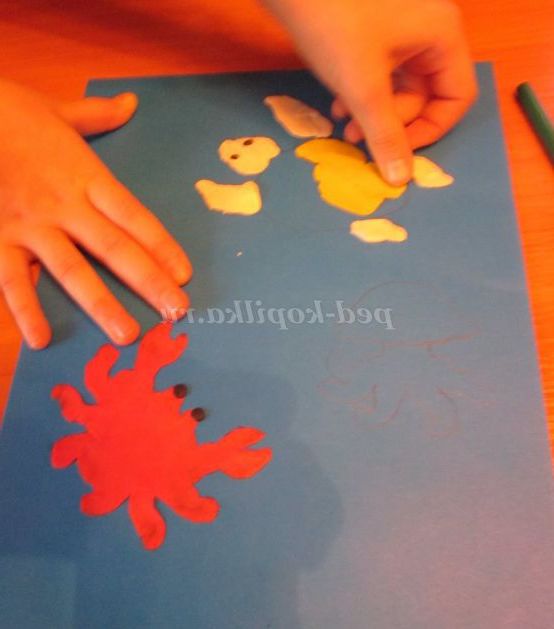 2. Для подальшого виконання роботи нам знадобиться пластилін. Не виходячи за контури зображення, розмазуємо маленькі шматочки пластиліну на зображеннях наших морських мешканців