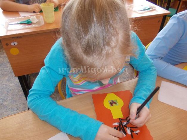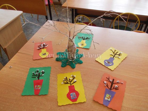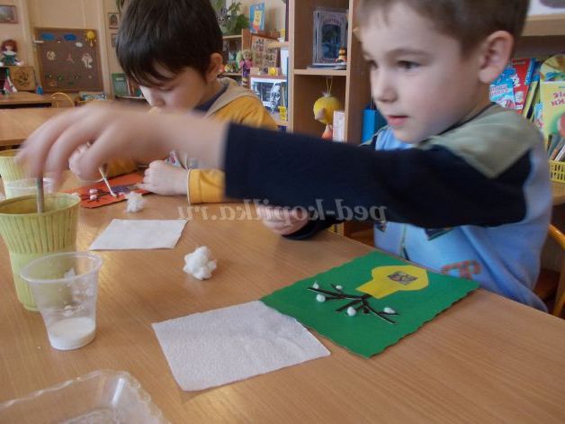 Вихователь - Спочатку ми з коричневого паперу нарізаємо невеликі смужки для гілки верби. Потім беремо вазу, намазуємо її клеєм. Приклеюємо на картон. Не забувайте прибирати зайвий клей серветкою. Тепер приклеюємо гілку. Потім скачуємо з вати невеликі грудочки і приклеюємо їх до гілки. Всім зрозуміло як виконувати, тоді приступаємо. Самостійна діяльність дітей. Під час роботи слідкую за їх діяльністю, за необхідності допомагаю. Після того, як всі діти закінчать свою роботу, розкладаємо аплікації на столах і розглядаємо їх.