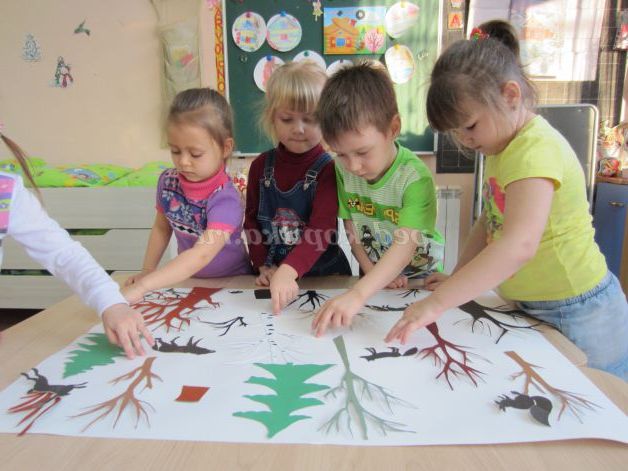 Діти викладають на лист ватману дерева, питаю, хто яке дерево «садить».