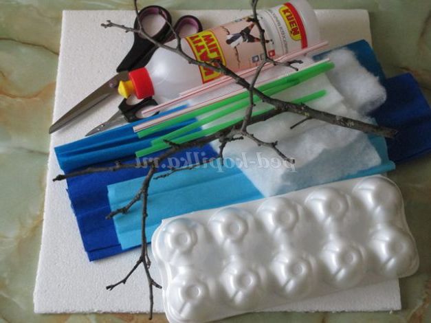 Матеріал: стельова плитка, упаковка від яєць, гофрований папір зеленого, синього і блакитного кольору, клей стельовий, синтепон, коктейльні трубочки білого і зеленого кольору, рожева серветка, канцелярський ніж, ножиці великі і маленькі, суха гілочка, декоративна метелик.