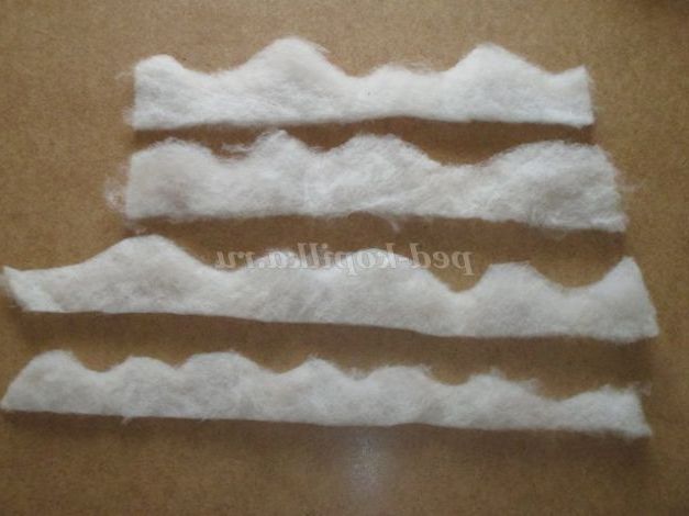 3.якщо ми зробили небо з хмар, і рамку зробимо «хмарну». Вона буде з синтепону, немов легке пухнасте біле хмара. Довільно вирізаємо смужки синтепону хвилястими лініями і надрываем хвилясту бік, надаючи пухнастість. Наклеюємо по краях основи.