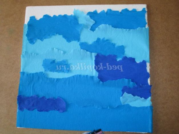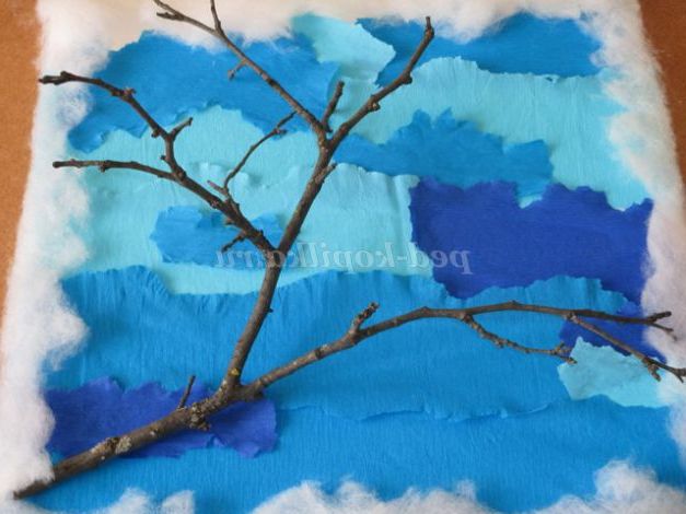 1.Под основу ми беремо стельову плитку. Визначаємо розмір основи: кладемо обрану гілочку на стельову плитку і помічаємо зайве, а потім відрізаємо ножицями. На основі з гофрованого паперу зробимо небо. Для цього візьмемо папір різних відтінків синього кольору і будемо довільно відривати від цілого шматка невеликі смужки з нерівними краями - це хмари.
