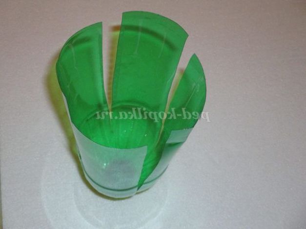 12. Робимо листя. Для цього беремо пластмасову пляшку зеленого кольору і відрізаємо дно пляшки.