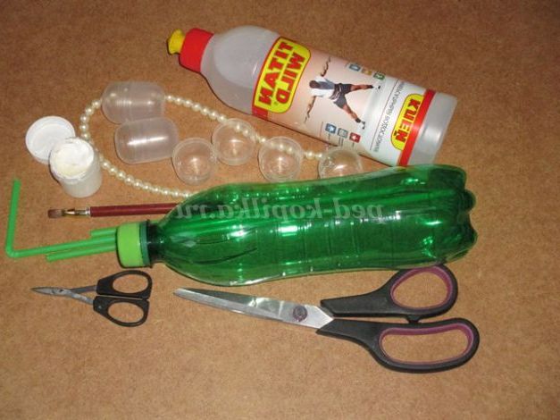 Матеріал: пластмасова пляшка зеленого кольору, футляри від шоколадних яєць (або від гумових рукавичок, від медичних бахіл), коктейльні трубочки зеленого кольору, ножиці, стельовий клей, перлинні намистинки, біла гуаш, пензлик.
