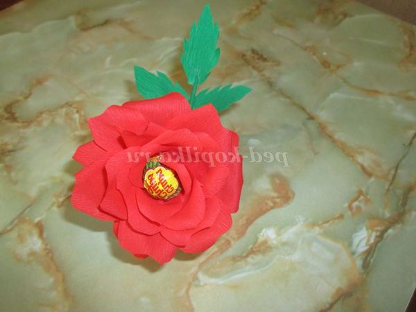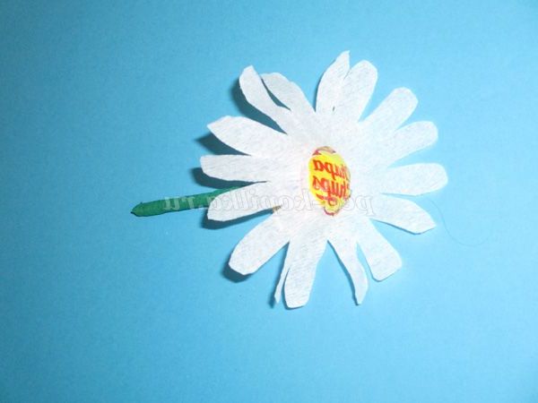 9. Вирізаємо прямокутник зеленого кольору заввишки з «Чупа-чупс», складаємо навпіл по довшій стороні і зрізаємо кути до лінії згину. Приклеюємо на стебло.