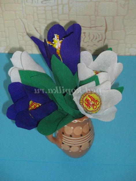 У перший весняний святковий день 8 березня усі жінки чекають привітань, подарунків, квітів. А, щоб чоловіки не забували зробити це, думали про це заздалегідь, намагалися піднести подарунок незвично, ми повинні з малих років навчити хлопчиків проявляти увагу, турботу, повагу, любов до милим жінкам. Тому давайте навчимо хлопчиків бути уважними до дівчаткам вже в дитячому саду в своїй групі, в школі у своєму класі і далі... Хочеться показати як ми з хлопчиками оформили квіти на цукерках «Чупа-чупс». Цю ідею можна внести і як сюрпризный момент на ранок, присвячений 8 березня. Тут можна використовувати будь-якого героя, який йде збирати підсніжники - це Весна, Попелюшка, герої-звірі, Омелько. І ось які солодкі квіти можна приготувати дівчаткам.