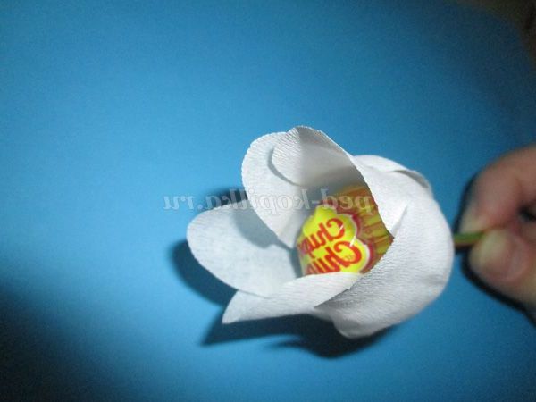 2.якщо обгортка у «Чупа-чупс» закручується зверху і стирчить «хвостик», то робимо на «хвостику» надрізи і вирізаємо смужку паперу для пелюсток так, щоб вона закривала ці «хвостики».