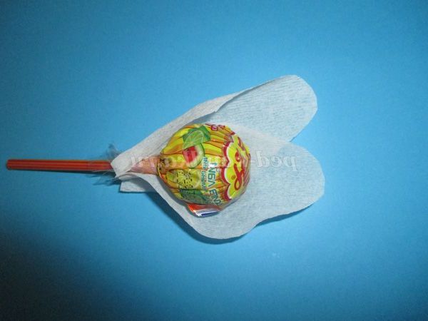 16. Наклеюємо її на «Чупа-чупс» так, щоб була видна вся жовта серединка квітки.