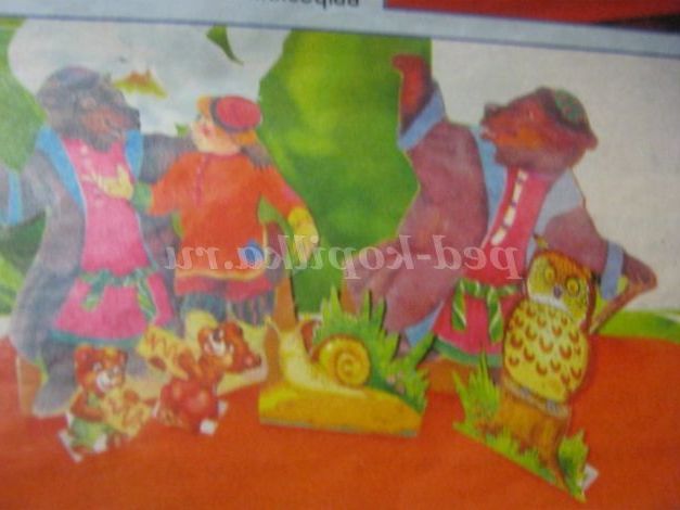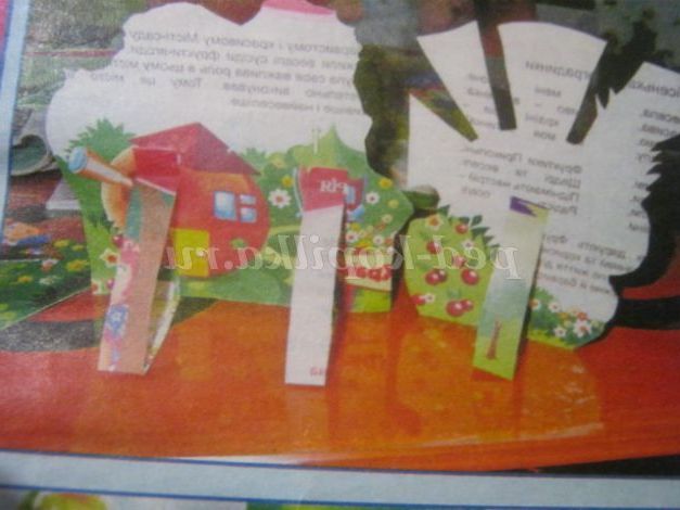 Вчитель. На всі великі вирізки приклеюємо трикутну підставку, а для всього іншого вирізаємо прямокутник з картону, складаємо навпіл і на одну з половинок приклеюємо складову для театру. Вчитель показує зразок