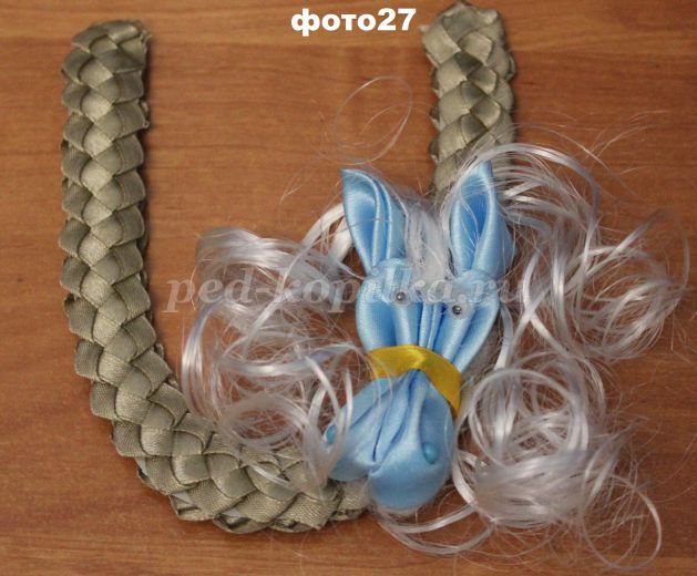 Для роботи нам знадобиться: картон, , кілька метрів сірої стрічки шириною 5 мм, трохи атласної стрічки (10 см) білого кольору, 50 см блакитний атласної стрічки шириною 5 см, трохи жовтої стрічки шириною 5 мм, універсальний, оченята, намистинки-ніздрі, 30 см блакитний атласної стрічки шириною 5 см, трохи штучних волосся, паяльник електричний, пінцет.