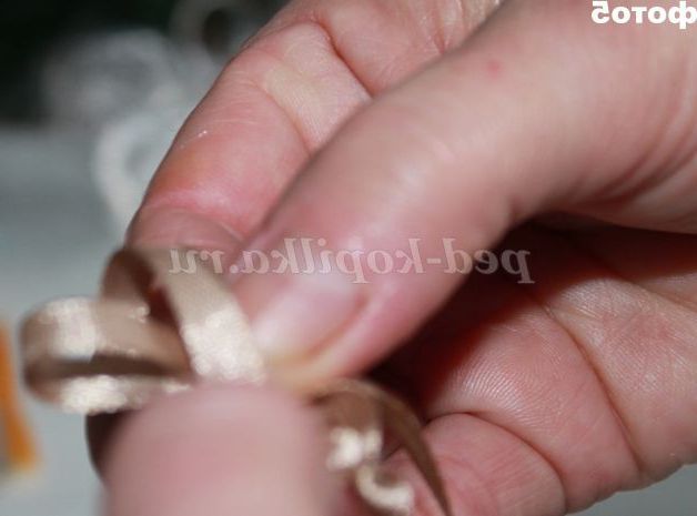 Блакитну стрічку розрізаємо на 6 квадратів розміром 5 см на 5 див. Складаємо 4 круглих пелюстки