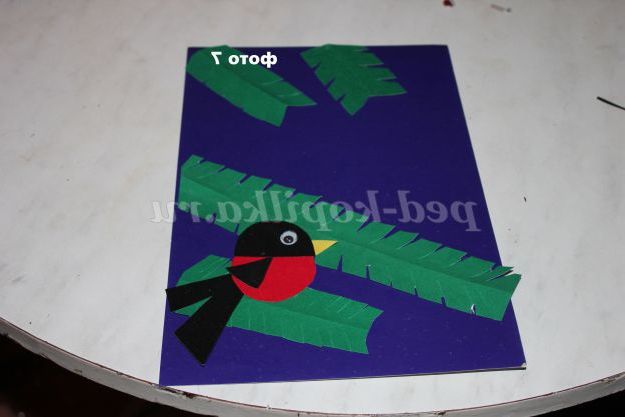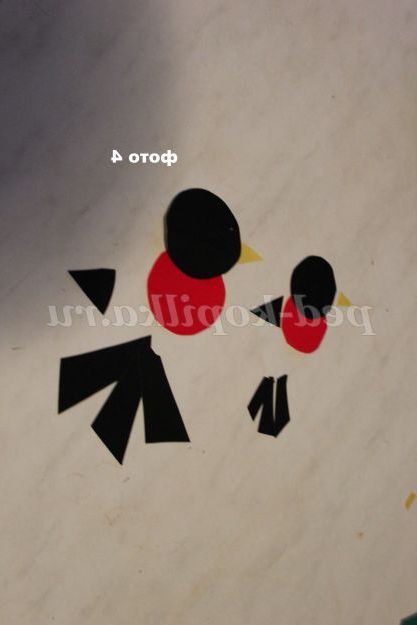 З червоного паперу виріжте два кола - один діаметром 3 см, інший діаметром 4 див. З чорної оксамитової папери також вирізаємо один коло діаметром 3 см, інший 4 см, з чорною оксамитовою паперу виріжте пір'ячко для хвостика і крильце на грудку