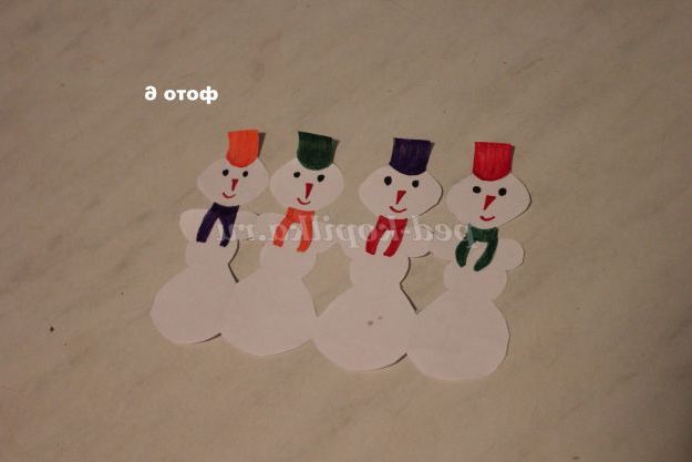 Намажемо клеєм першого і останнього сніговика. Приклеїмо першого і останнього сніговика, так що б лінії згинів листівки і центральних сніговиків збіглися.
