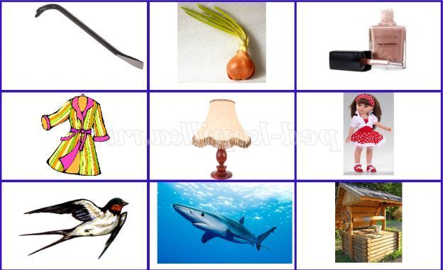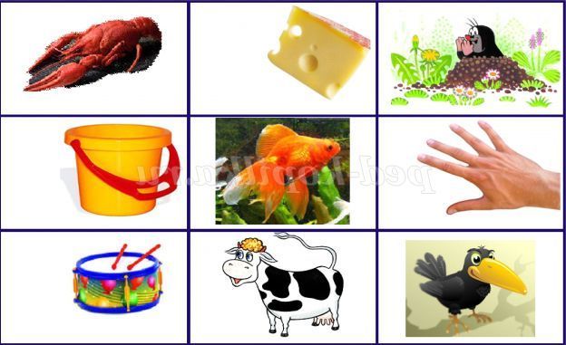 Дитина: кріт, сир, рак, рука, риба, відро, ворона, барабан, корова.