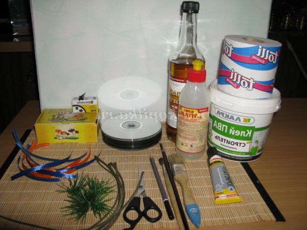 Заздалегідь необхідно приклеїти клеєм «момент Кристал» різнокольорову тасьму до зворотної (не дзеркальної) стороні CD диска.