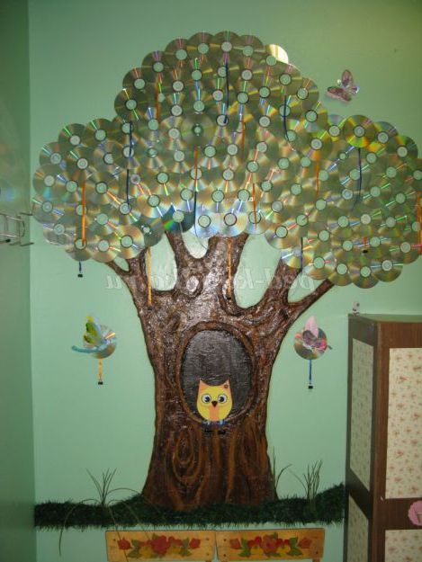 Наше дерево готове. Погодьтеся - захоплюючий процес не складних матеріалів! А скільки захоплення і радості викликає це диво - дерево у дітей! Травичку можна помацати, помилуватися казковими переливами сяючих дисків. Але головне, тепер роботи дітей казково зустрічають всіх, що входять в групу.