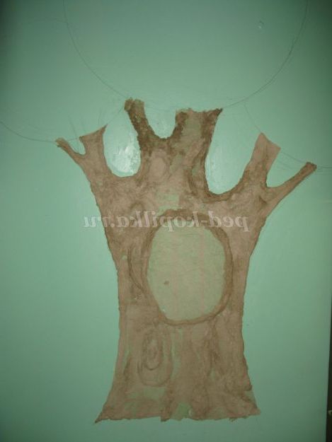 Для цього необхідно нарвати туалетний папір довільними смугами від 20 до 50 см, розмір не так вже і важливий. Сминаем довільно, мачає в клей ПВА (не розведений водою) і наносимо на стіну, створюючи стовбур дерева, імітуючи його кору, в техніці пап'є-маше. Тут вже даємо волю своїй уяві.