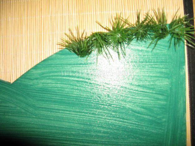 Плитку попередньо офарблюємо в зелений колір, щоб не просвічувала. І після висихання, приклеюємо на потрібне нам місце, додаючи, якщо потрібно, додаткові травички, які будуть під рукою.